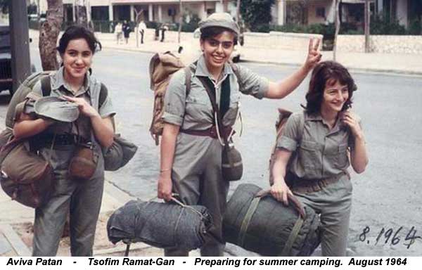 During almost all her youth, till her military service, Aviva was a member in this world wide institution, “The girls and boys scouts federation”, in Ramat Gan.Here with friends, going to a summer jamboree ( a camping meeting of delegations from several towns in Israel)