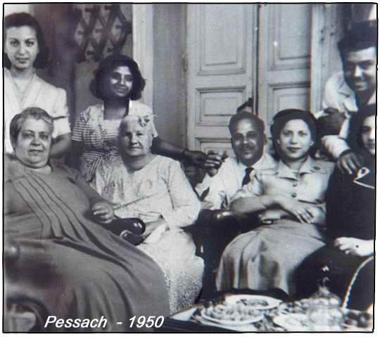 Photo souvenir avec la nona Marietta a Pessah 1950, et les bonnes choses qu’elle nous faisait,… Comme toujours a Pessah, on voit a table, la carafe d’Arak et plein de fruits secs. C’est la tradition.Avec la nona, il y a la tante Victoria, Mimi, les Harari Sami et Yvette et une partie des visages d’Elie et Mary.