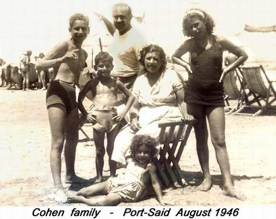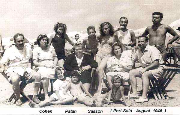 August 1946,…2 weeks of holiday , in the city of Port-Said on the mediterranean sea, at the entrance of the Suez canalSouvenir on the beach, with the Patan family, and Albert Sasson and his wife Emilie.