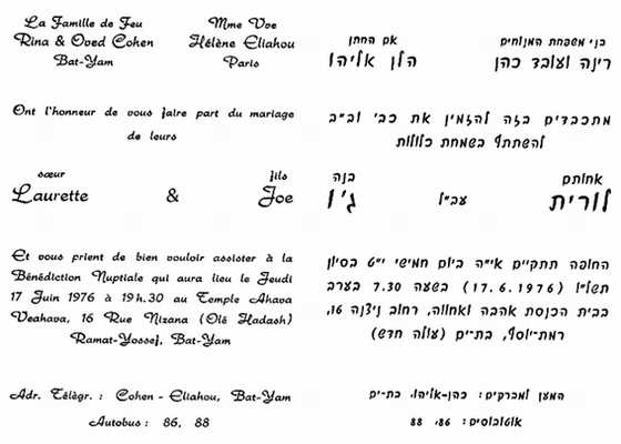 Laurette (Paula) Cohen, nee au Cairo (Egypt) le 1.6.1945, mariee a Joseph Eliahou, ne au Cairo le 16.6.1942, Le mariage civil eut lieu en France le 21.5.1976. Le mariage religieux eut lieu en Israel le 17.6.1976.