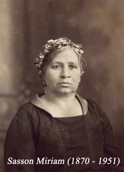 NONNA MARIETTA SASSON If you want to learn more about my NONNA MARIETTA, and her SASSON family, press on this link … press HERE Marietta (Miriam in Syrian) married in Cairo (Mar1885) to Yitzhak Sasson. They lived in Luxor, then in Cairo. Only 5 children survived to advanced age, but many died very young. The first son, Meyer born in 1886, then died. After the birth of her daughter Hamama in 1887, she had several babies, but they all died during a period of 11 years, until her son Jacques, was born in 1898, Then Victoria in 1901, Esther 1904, and Albert 1909. The family moved back to Cairo. After her husband death, she lived with her daughter Victoria, until she died in 1951, aged 81