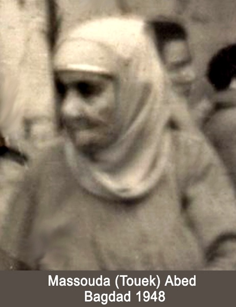 Massouda Abed, ( born Toueg ) Born, lived and died in Baghdad (Iraq). Married to Eliahou Abed מסעודה טויק , נשואה לאליהו עאבד נולדה, חיה, ונפטרה בבגדד, עירק