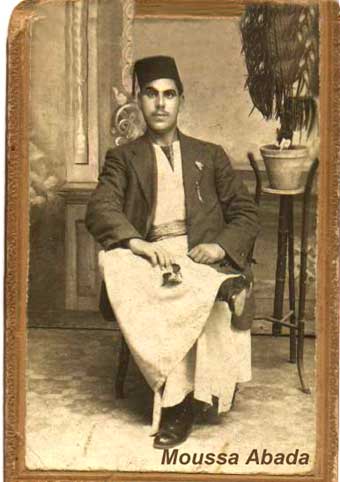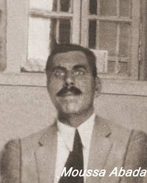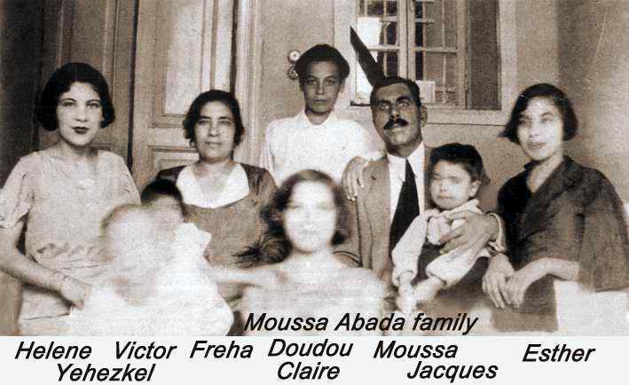 ENGLISH: The roots of the Abada family begin in Baghdad, the capital of Iraq. There was always an important Jewish community in this country, since the biblical exodus to Babel. In the end of the 19th century, all the Middle East was part of the Ottoman Empire. Then Yehezkel Abada, his wife and 7 children, (all boys), immigrate to Egypt, thru Lebanon and Palestine. The family lived in Tanta, a city in the Nile delta, north of Cairo. In 1917, Moussa Abada, the third son, married with Freha Mekayess, and had 9 children. Later on the family moved to Cairo. Moussa, like most of his brothers, worked with textile, and had a small shop in “Haret el Yahoud”, that’s the antique Jewish quarter in Cairo. He died in 1946. FRENCH: Les racines de la famille Abada, remontent a Baghdad, capitale d’Iraq, En cette fin du 19 eme siecle , tout le moyen orient faisait partie de l’empire Ottoman.C’est alors que Yehezkel Abada, sa femme et ses 7 enfants, tous des garcons, et nes a Baghdad, emigrerent vers l’Egypt, via le Liban et la Palestine. Ils s’etablirent a Tanta, ville dans le delta Egyptien au nord du Cairo. En 1917, Moussa Abada , 3eme garcon, se maria avec Freha Mekayess, et eurent 9 enfants. Plus tard la famille demenagea au Cairo. Moussa, comme la plupart de ses freres, travaillait dans le textile et avait un petit magasin a “Haret El Yahoud”, c’est l’antique quartier juif du Cairo.,… Il mourut au Cairo , en 1946.
