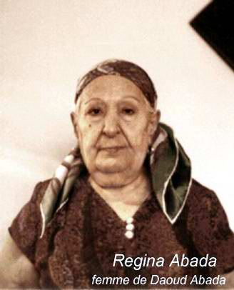 Regina, est nee au Cairo, et mariee a Daoud Abada. Le couple habitait Cairo. Tres peu d’informations, et assez vagues, a propos de la descendance de Daoud Abada, sinon qu’ils avaient 3 enfants,… Un garcon et 2 filles. En 1923, Daoud mourut a l’age de 32 ans, alors que son fils aine (Hayim) avait 6 ans. En 1949, le garcon, l’aine Hayim, emigra seul en Israel a l’age de 32 ans, mais les 2 filles, Touna et Farha, resterent en Egypt, s’y marierent et fonderent chacune sa propre famille En Israel, Hayim, se marie avec Esther Attiya et habite a Tirat Hacarmel, ou ils eurent 8 enfants. Regina , la maman, emigra en Israel en 1957, et habita pres de son fils,… et s’est remariee,.. Decedee en 1985,et enterree a Tirat Hacarmel. Elle eut un enfant de son second mariage.