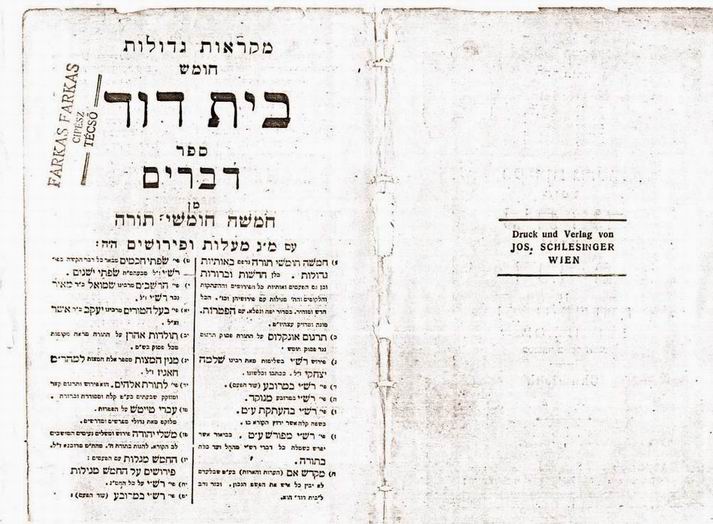 The Torah books of Farkas Farkas was found after the war and brought to Israel. This is a photo of the 1st page with his name stamp on the left.